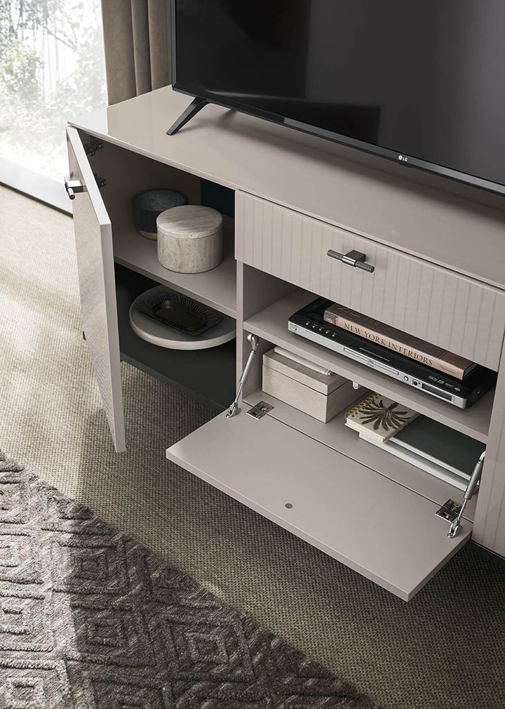 The TV unit has doors and two drawers and stands out for the unusual shape of its base in which the panels create plays of filled and empty spaces.