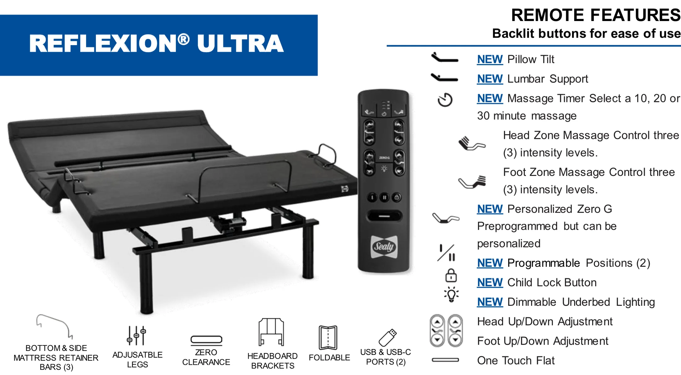 - Wireless Remote with Two (2) Programmable Positions & Personalized Zero G Feature (Reprogrammable)